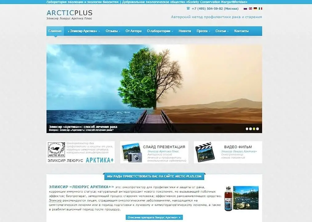 Примечания: «Эликсир Арктика Плюс», Промо сайт-представительство. Сайт создан «под ключ» в 2008-м году в доменной зоне .ru, в 2016-м полностью переделан и перенесен на новейшую версию cms Джумла! и переведен в доменную зону .com. Занесен в Яндекс и Google справочники. Состоит на технической поддержке, постоянно обновляется, регулярно производятся seo мероприятия.